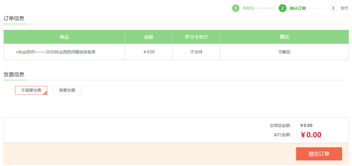 第一步:點(diǎn)擊“領(lǐng)取課程”直接進(jìn)入購物車,提交訂單,確認(rèn)支付“0元”;