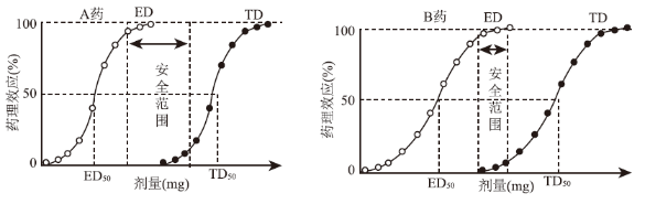 安全范圍 | 分析:安全范圍是ED95到LD5之間的范圍,也就是分別在ED曲線和TD曲線上找到ED95、LD5,橫坐標(biāo)軸上兩點(diǎn)之間的舉例即為安全范圍(如圖標(biāo)示),從圖中可以看出A藥安全范圍比B藥大,所以A藥更安全 |