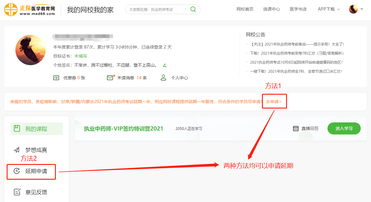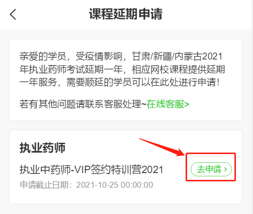 受疫情影響,甘肅、內(nèi)蒙古、貴州、寧夏等地2021年執(zhí)業(yè)藥師考試停考,新疆部分地區(qū)不能參加考試。為保證廣大學(xué)員正常學(xué)習(xí)備考,醫(yī)學(xué)教育網(wǎng)為廣大考生提供課程延期服務(wù),也就是說(shuō),已報(bào)考2021年執(zhí)業(yè)藥師,并且購(gòu)買(mǎi)2021年醫(yī)學(xué)教育網(wǎng)執(zhí)業(yè)藥師課程或續(xù)學(xué)2021年課程的考生,符合條件的可申請(qǐng)課程延期!延期入口已開(kāi)通,具體流程如下: