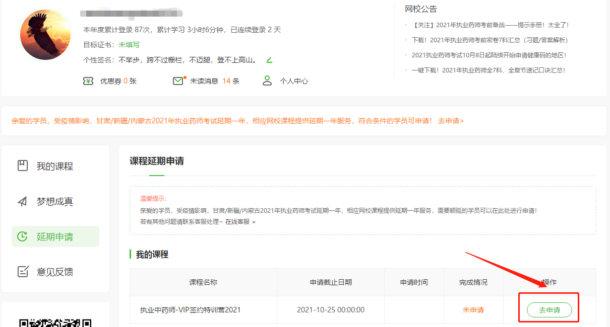 (1)在“我的網(wǎng)校我的家”中(我的家入口>),點(diǎn)擊“延期申請(qǐng)”或上方的“去申請(qǐng)”,進(jìn)入申請(qǐng)頁(yè)面;