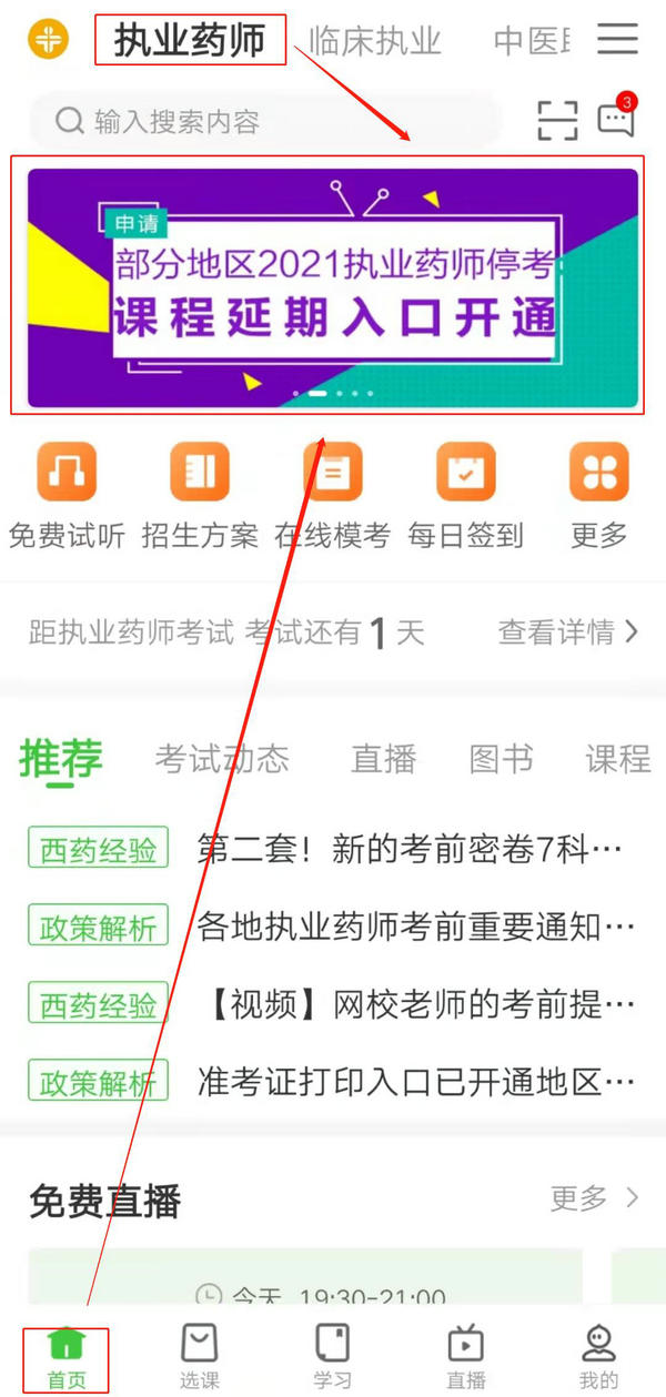 (1)打開(kāi)APP,進(jìn)入執(zhí)業(yè)藥師首頁(yè),在頂部輪播圖部分,找到下圖,點(diǎn)擊進(jìn)入;