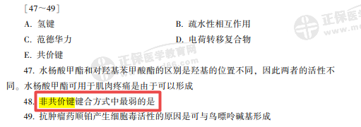 5、在藥物與受體結(jié)合過(guò)程中,結(jié)合力最強(qiáng)的非共價(jià)鍵鍵合形式是:離子鍵。
