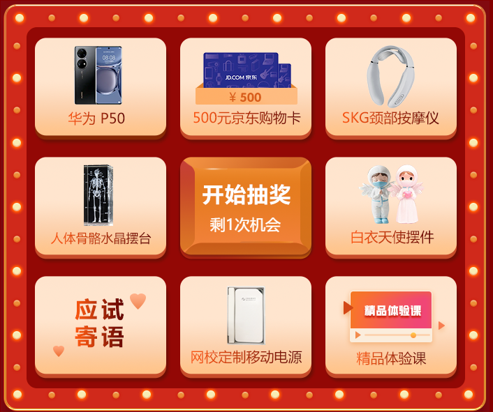 活動(dòng)期間(2021年11月5日00:00-11月11日23:59:59)每人1次抽獎(jiǎng)機(jī)會,官網(wǎng)下單購買任意活動(dòng)課程可再增加1次抽獎(jiǎng)機(jī)會~有機(jī)會獲得華為P50、京東購物卡,SKG頸部按摩儀等精美禮品~