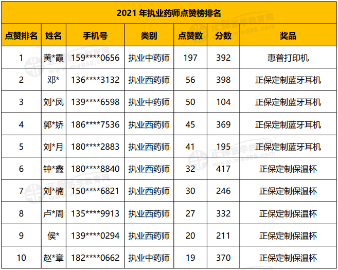 【點(diǎn)贊榜】2021年執(zhí)業(yè)藥師曬分活動點(diǎn)贊榜獲獎名單公布