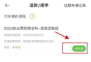 2、選擇可以申請續(xù)學的課程,點擊“去申請”。
