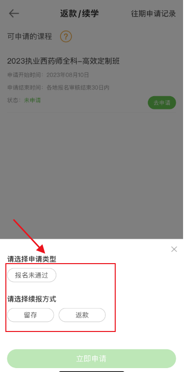 3、在彈框內(nèi)容中選擇“報名未通過”-“留存”或者“返款”,點擊“立即申請”進入信息填寫。