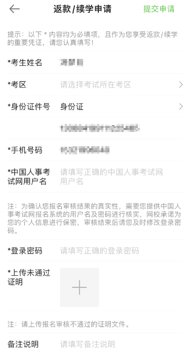 4、按照頁面要求逐項登記填寫退費信息,首先核實考生姓名、手機號碼、身份證信息是否正確,上傳中國人事考試網(wǎng)用戶名等,填寫完畢后點擊“提交申請”。