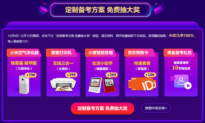 12月9日-12月12日期間,點擊下方“定制備考方案 免費抽大獎”按鈕,提交資料,即可免費抽取下方獎品。獎項隨機(jī)抽取,中獎幾率100%,每人限抽取1次!