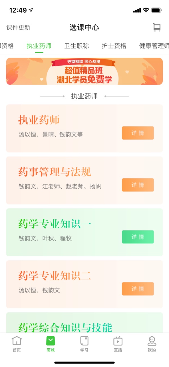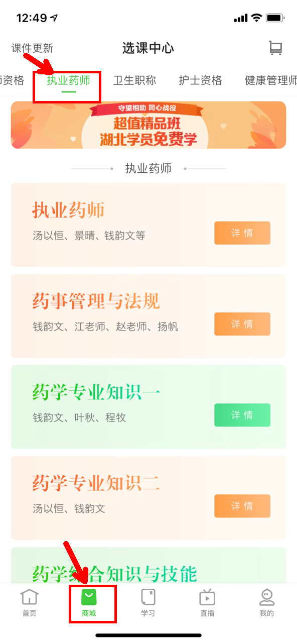 (3)點(diǎn)擊“商城”→“執(zhí)業(yè)藥師”→選擇任意科目,如“藥事管理與法規(guī)”,進(jìn)入招生方案葉
