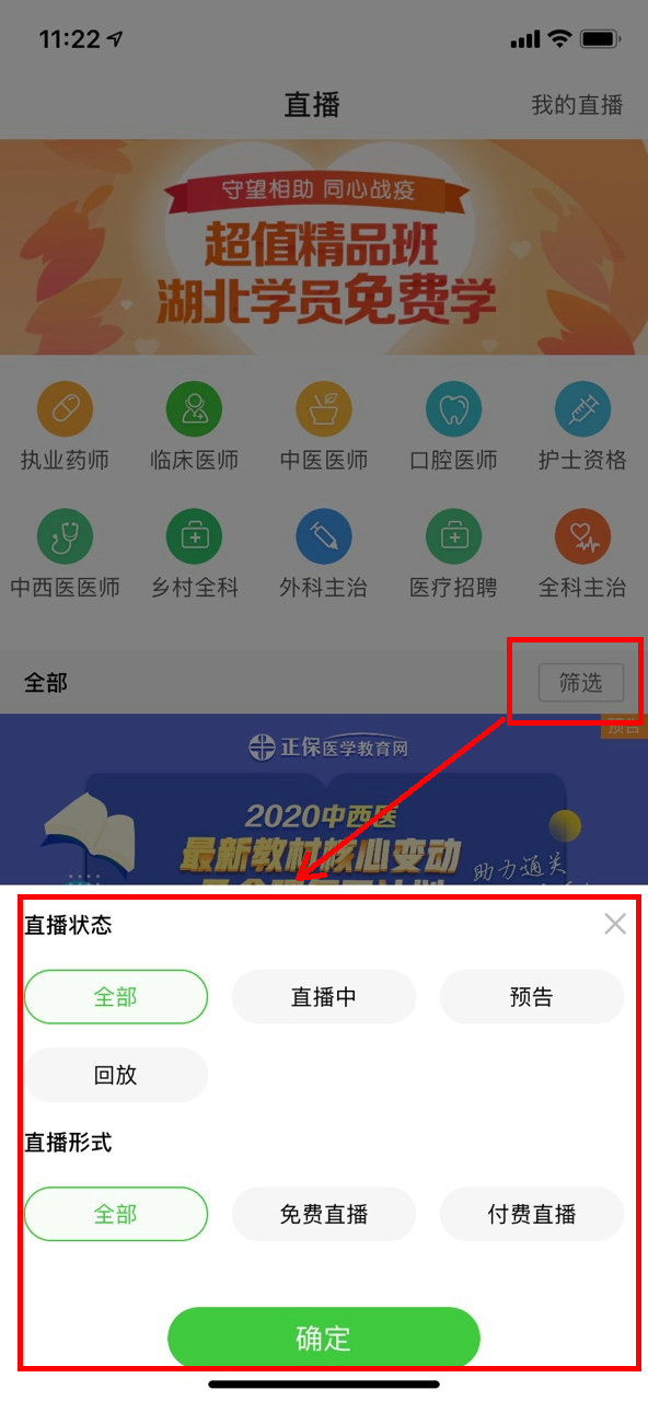 點(diǎn)擊“直播”→“執(zhí)業(yè)藥師”,即可查看近期執(zhí)業(yè)藥師免費(fèi)直播及付費(fèi)直播,選擇你感興趣的,觀(guān)看直播,還可以進(jìn)行“篩選”哦。