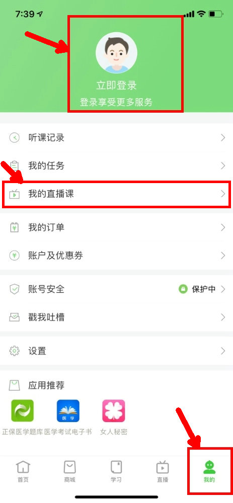 1、點(diǎn)擊“我的”→“立即登錄”,輸入賬號(hào)、密碼,這里有一個(gè)“我的直播課”,點(diǎn)擊進(jìn)去可以查看班次所包含的全部直播課。