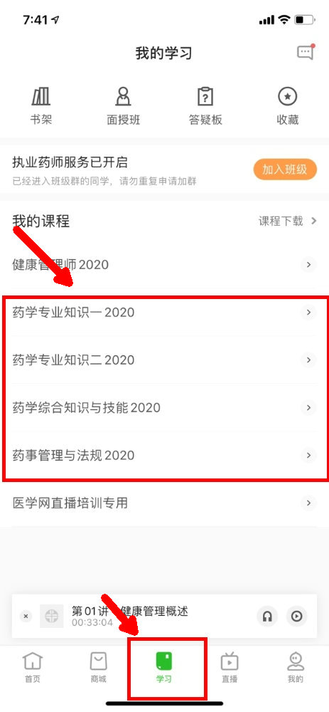 (1)點(diǎn)擊“學(xué)習(xí)”,選擇你要學(xué)的科目,例如選擇“藥學(xué)專(zhuān)業(yè)知識(shí)一2020”。