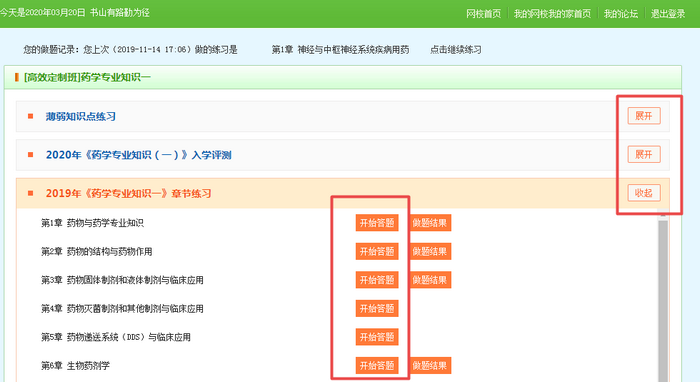 5、進(jìn)入題庫后,選擇你想要訓(xùn)練的內(nèi)容,如“2019年《藥學(xué)專業(yè)知識(shí)一》章節(jié)練習(xí)”,點(diǎn)擊“展開”→“開始做題”,即可進(jìn)入做題頁面。