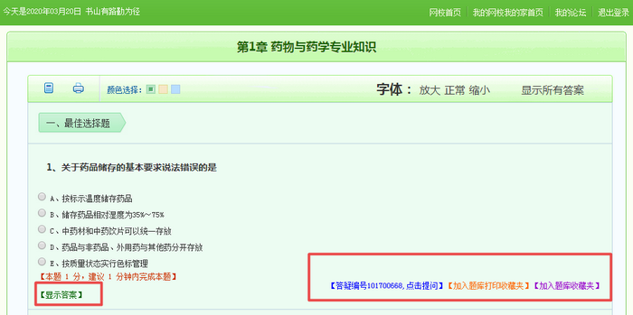 6、在做題頁面,是有很多功能的,如“顯示答案”,“收藏”,“提問”,“顏色選擇”和“字體大小調(diào)整”等。