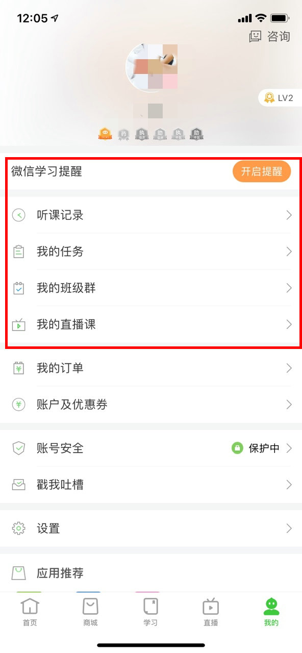 點(diǎn)擊紅框內(nèi)相關(guān)按鈕,即可:查看“聽課記錄”、進(jìn)入“我的班級(jí)群”、查看“我的直播課”。