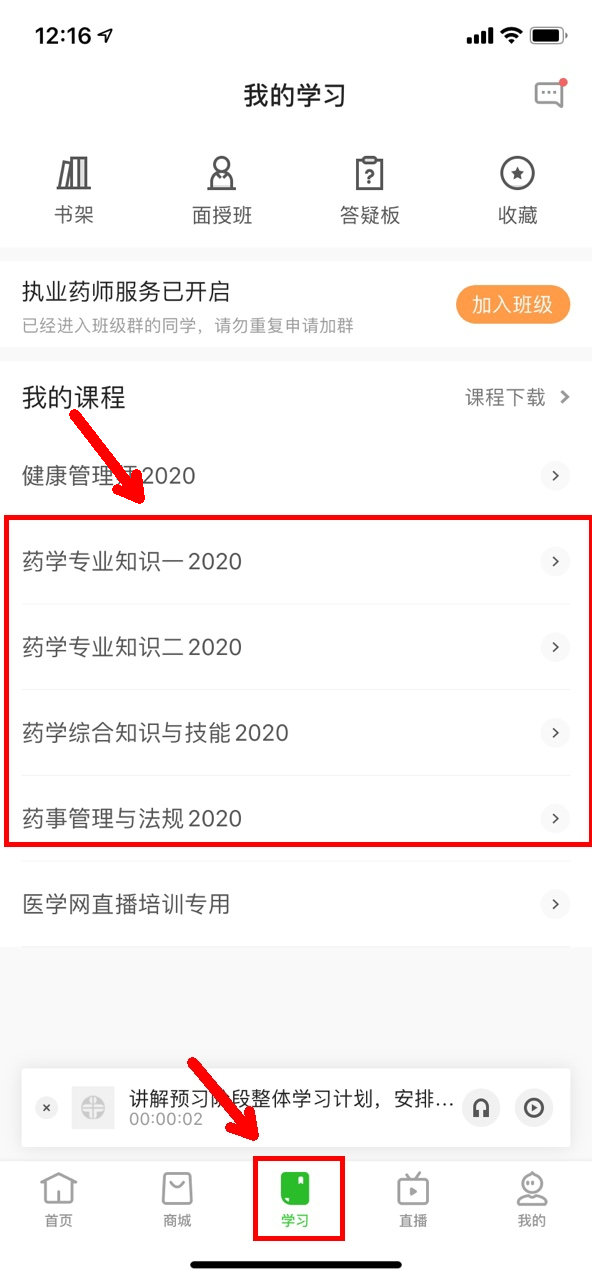 2、點(diǎn)擊“學(xué)習(xí)”,并選擇自己想學(xué)的科目,如“藥學(xué)專業(yè)知識(shí)一2020”。
