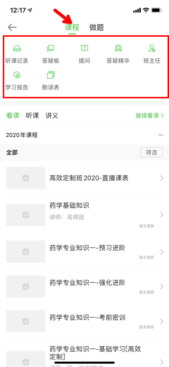 3、點(diǎn)擊“課程”,除了可以聽課、查看講義、還可以進(jìn)行“提問”、找“班主任”、查看“學(xué)習(xí)報(bào)告”等。