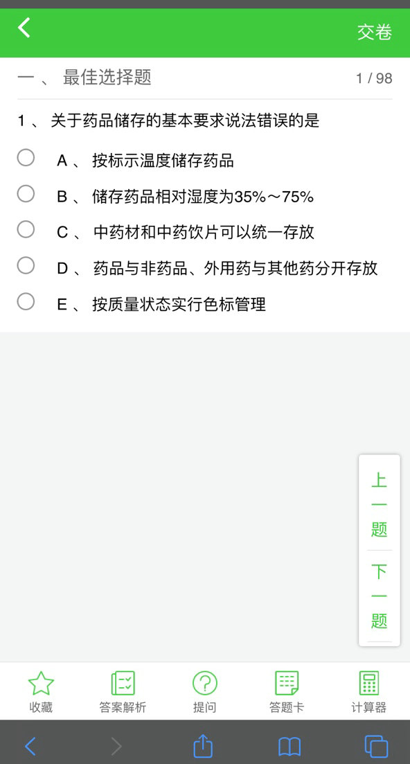7、做題頁面有很多功能:“收藏”、“答案解析”、“提問”、“答題卡”、“計算器”等。