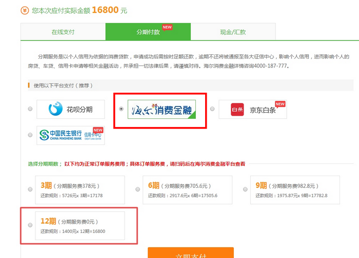 1、海爾12期分期免息