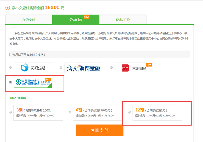 2、中國(guó)民生銀行12期分期免息