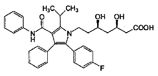 阿托伐他汀 | 7-[2-(4-氟苯基) -3-苯基-4-(苯氨基羰基)-5- (2-異丙基)-1-吡咯基]-3,5-二羥基-庚酸 | 吡咯環(huán) | 降血脂藥 | |