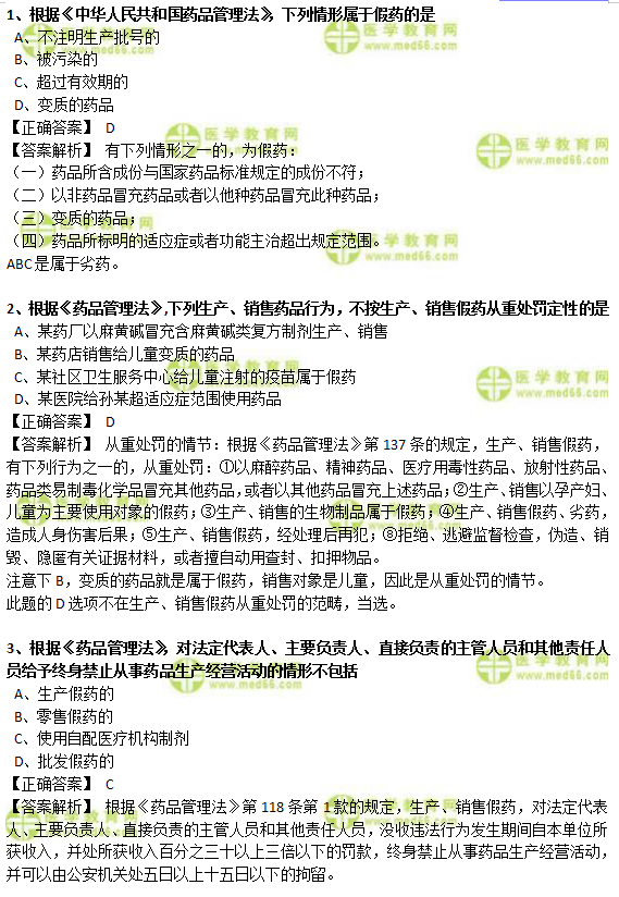 我們在平常練習過程中,就需要養(yǎng)成良好的做題習慣。做題時要認真讀題、審題,先看清題意,再思試題干和題肢之間的關聯(lián),然后才開始解答。答完題以后,再整體檢查答題思路。每一分都至關重要,大家要認真踏實備考,努力拿到更多的分數(shù)。以下是醫(yī)學教育網(wǎng)為大家提供的“生產(chǎn)/銷售/使用假劣藥的法律責任”習題練習,分值占比10~15分!