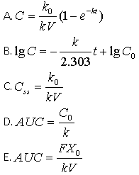 【答案解析】血藥濃度用C表示,所以在選項AB中選擇,選項A含有靜滴速率常數(shù)k0,為單室模型靜脈滴注給藥血藥濃度公式,選項B是單室模型靜脈注射給藥血藥濃度公式。