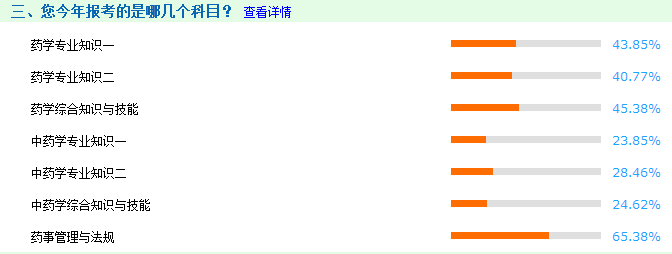 下圖的數(shù)據(jù)統(tǒng)計(jì)結(jié)果顯示,一年報(bào)考4科的人數(shù)居多。另外藥綜和中藥二科目報(bào)考人數(shù)占比相對(duì)較多(從網(wǎng)校學(xué)員反饋數(shù)據(jù)來(lái)看,如有異議,請(qǐng)以官方數(shù)據(jù)為準(zhǔn))。