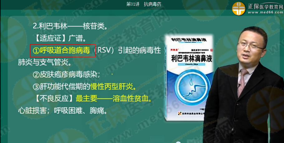 【解析】利巴韋林為合成的核苷類(lèi)抗病毒藥。體外細(xì)胞培養(yǎng)試驗(yàn)表明,利巴韋林對(duì)呼吸道合胞病毒(RSV)具有選擇性的抑制作用。