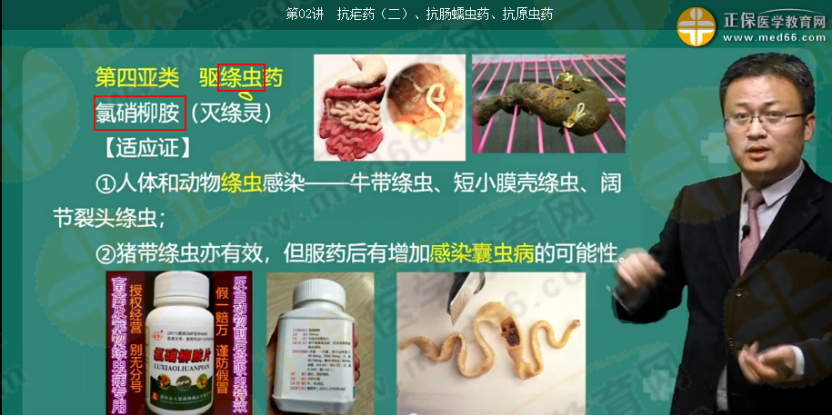 【解析】氯硝柳胺用于人體和動(dòng)物絳蟲(chóng)感染,為治療牛帶絳蟲(chóng)、短小膜殼絳蟲(chóng)、闊節(jié)裂頭絳蟲(chóng)等感染的良好藥物。對(duì)豬帶絳蟲(chóng)亦有效,但服藥后有增加感染囊蟲(chóng)病的可能性。