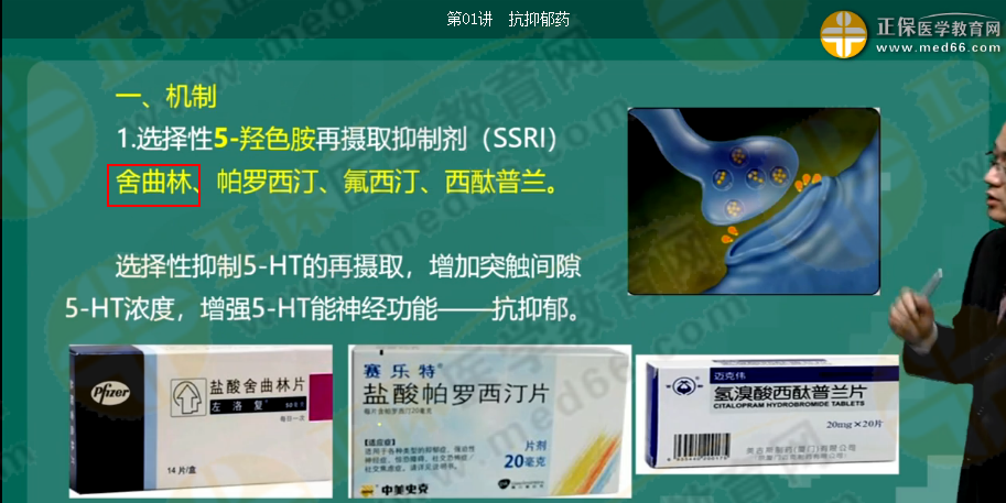 【解析】選擇性5 -羥色胺再攝取抑制劑(SSRI)主要通過(guò)選擇性抑制5 -HT的再攝取,增加突觸間隙5-HT濃度,從而增強(qiáng)中樞5- HT能神經(jīng)功能,發(fā)揮抗抑郁作用。代表藥物有氟西汀、帕羅西汀、舍曲林、西酞普蘭等。