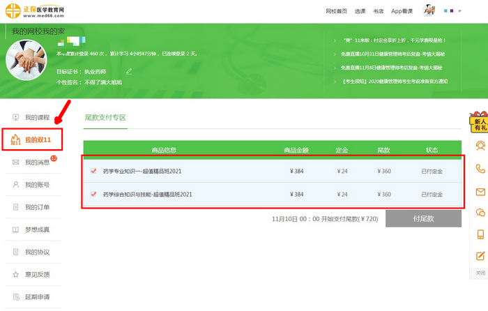 一年一度的醫(yī)學(xué)教育網(wǎng)“爽”11活動終于來了,已經(jīng)付過定金的考生!你知道怎么付尾款嗎?以下是具體的流程,快來看看!