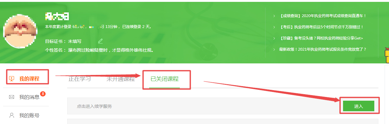 (1)在“我的網(wǎng)校我的家”中,查看“已關(guān)閉課程”,點(diǎn)擊“進(jìn)入續(xù)學(xué)服務(wù)”;