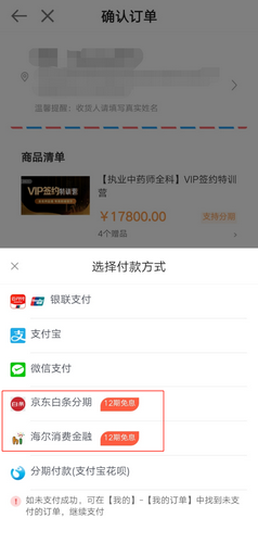 4、選擇付款方式部分,選擇京東、海爾分期支付。