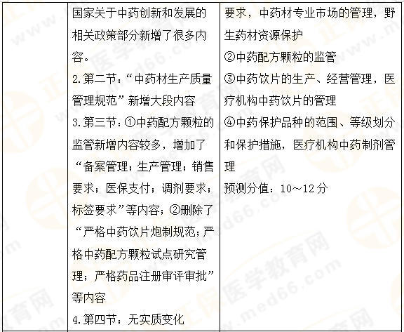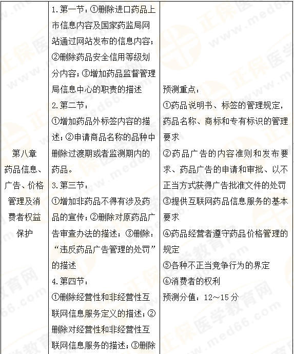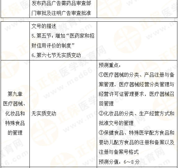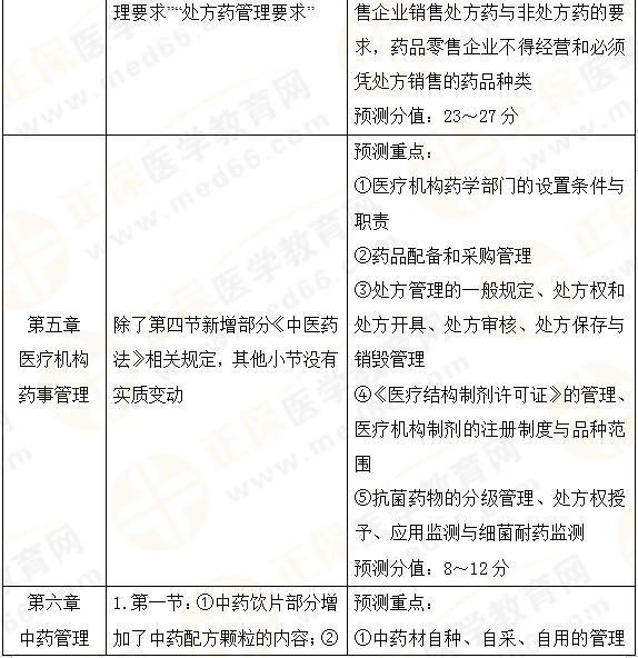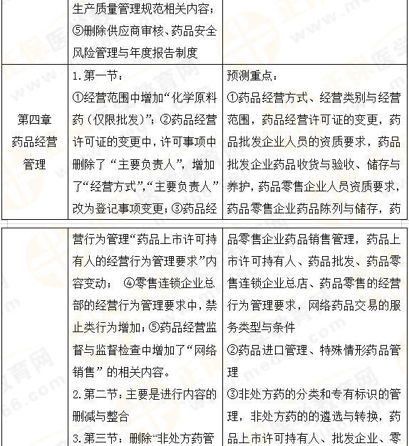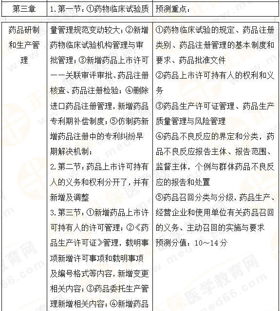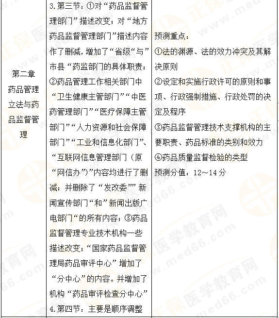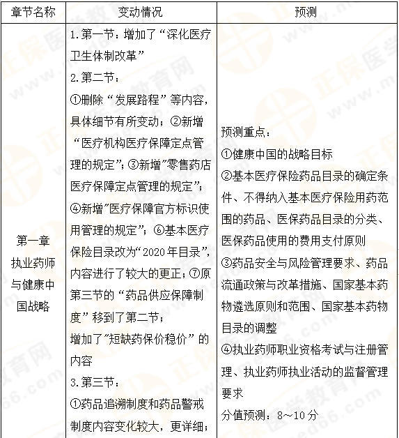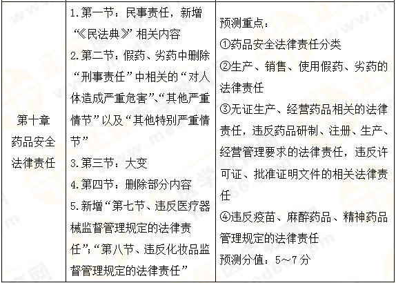 千呼萬喚始出來,翹首企足已久的2021年《藥事管理與法規(guī)》的官方教材終于與大家見面了,按照慣例(大綱、教材每年變化20%-30%),2021年教材內(nèi)容總體變動約在30%,其中刪除的內(nèi)容與增加的內(nèi)容比例相當,而變化的地方更多的是細節(jié)內(nèi)容。立足于歷年考情,小編預測2021年各章節(jié)分值與重要考點匯總?cè)缦拢?/span>