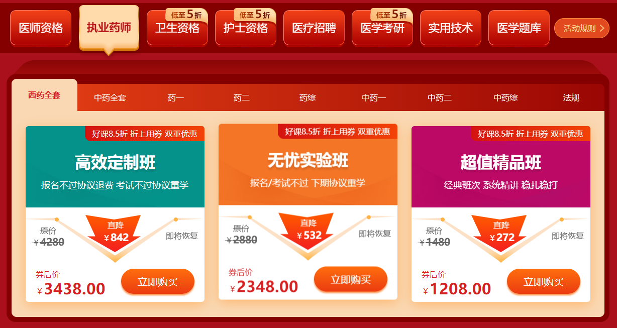 3.護(hù)士資格超值精品班、2023年西醫(yī)/護(hù)理考研超值精品班、護(hù)士/衛(wèi)生資格密題庫(kù)活動(dòng)折扣為5折,不支持使用優(yōu)惠券;