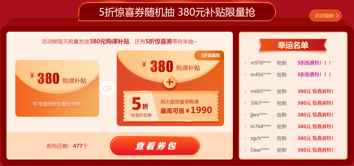 (2)5折驚喜券:可用于所有參與活動折扣的課程,不可與其他優(yōu)惠券疊加使用。