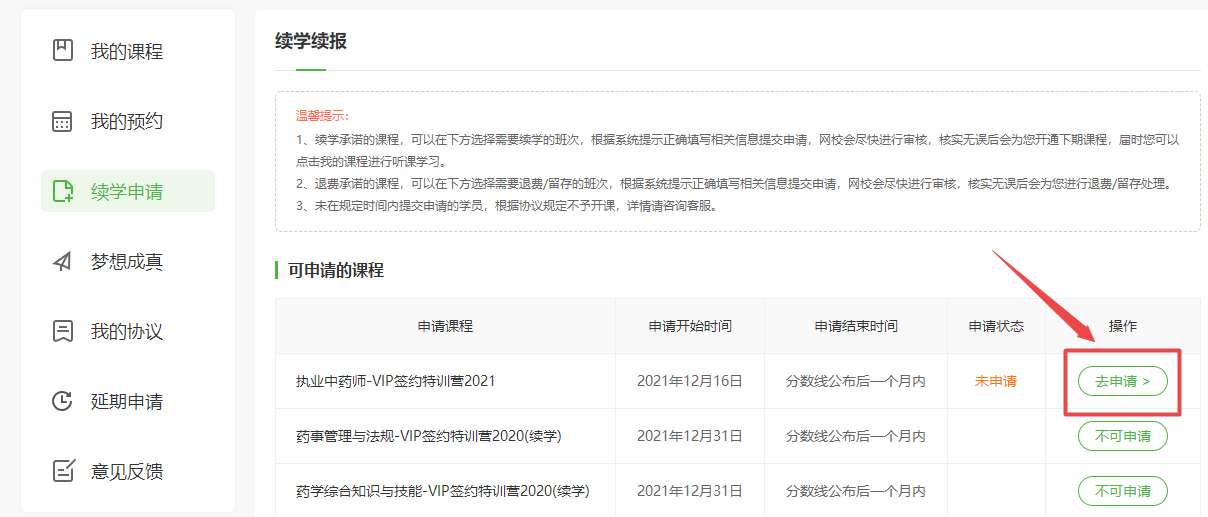 2021年執(zhí)業(yè)藥師輔導課程VIP簽約特訓營協(xié)議續(xù)學申請流程講解