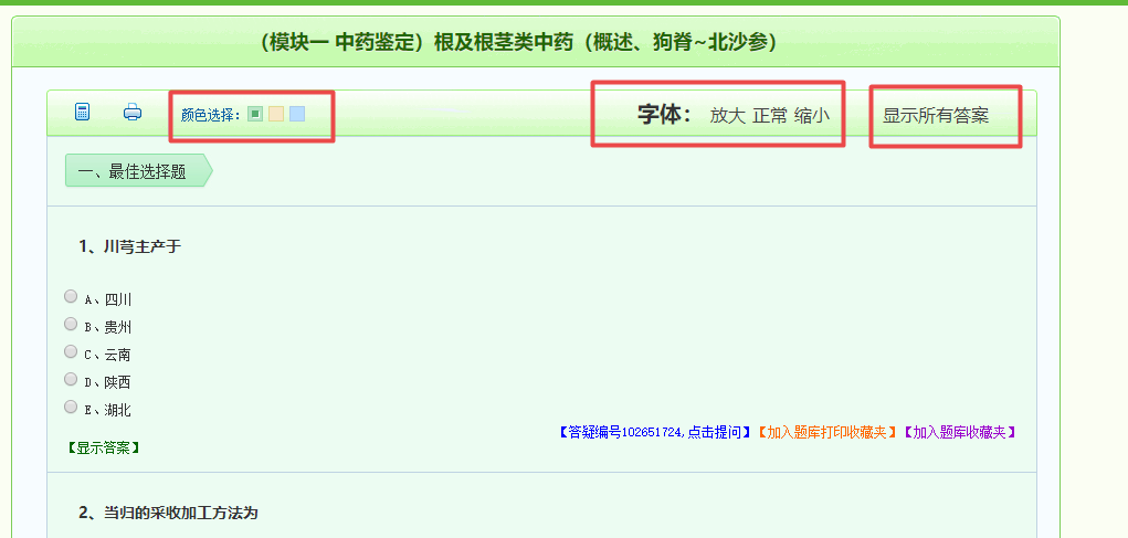6、在做題頁面,是有很多功能的,如“顯示答案”,“收藏”,“提問”,“顏色選擇”和“字體大小調(diào)整”等。