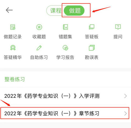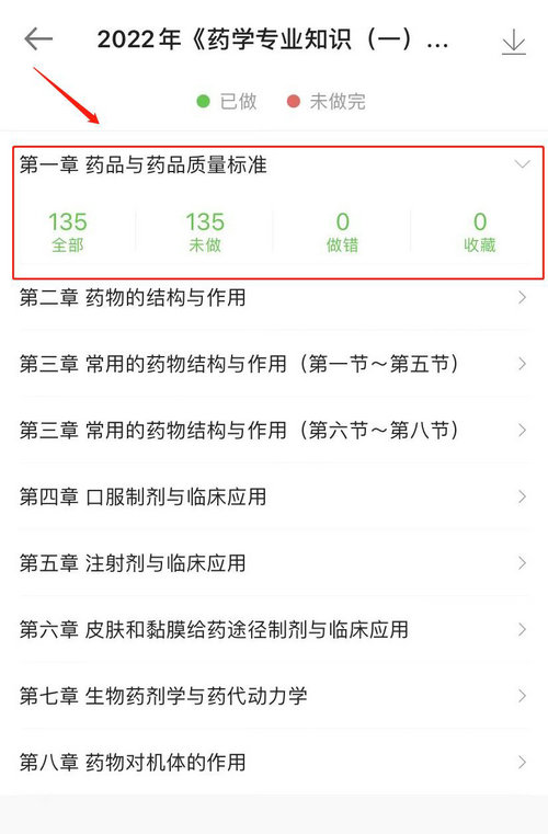 4、選擇你想要的做題內(nèi)容,如小編選擇的“2022年《藥學(xué)專業(yè)知識一》章節(jié)練習(xí)”,然后點擊你想要做題的章節(jié),選擇下方的四個選項(“全部”、“未做”、“做錯”、“收藏”),并點擊,即可進入做題頁面。