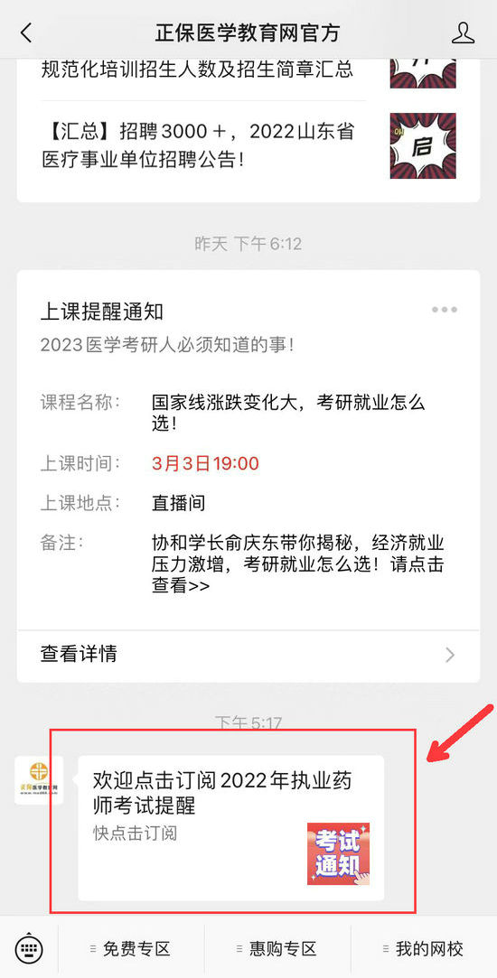 2022年執(zhí)業(yè)藥師考試報名預(yù)計在7-8月開始,很多考生擔心自己錯過考試報名時間,進行以上操作,實時關(guān)注公眾號的訂閱提醒,一旦有考試報名消息,醫(yī)學教育網(wǎng)將會通知大家!
