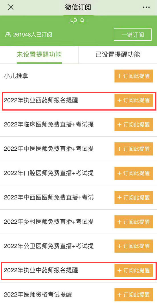 3、點擊進入,找到“2022年執(zhí)業(yè)西藥師報名提醒”或“2022年執(zhí)業(yè)中藥師報名提醒”,選擇其一,點擊“+訂閱此提醒”。