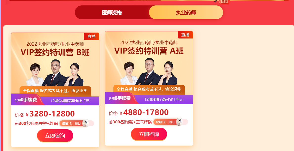 限時福利!僅限6月17日、18日兩天!2022執(zhí)業(yè)藥師VIP簽約特訓營(不含單科)分期免息+贈空氣炸鍋!沒錯,這就是2022年醫(yī)學教育網(wǎng)618年中盛典的優(yōu)惠活動,正在備戰(zhàn)執(zhí)業(yè)藥師考試,準備購買VIP簽約特訓營課程的考生,進到活動主會場看一看吧!