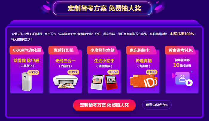 抽獎啦!抽獎啦!恰逢爽12來襲!醫(yī)學教育網(wǎng)12月9日-12月12日期間,點擊下方“定制備考方案 免費抽大獎”按鈕,提交資料,即可免費抽取下方獎品。獎項隨機抽取,中獎幾率100%,小米空氣凈化器、小度智能音箱等你帶回家!