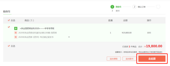 第二步:確認(rèn)選擇購買的課程,確認(rèn)后點(diǎn)擊“去結(jié)算”