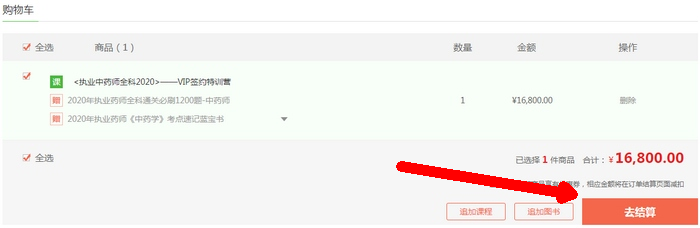 第二步:在購(gòu)物車(chē)內(nèi)確認(rèn)已選課程,確認(rèn)無(wú)誤后點(diǎn)擊“去結(jié)算”;