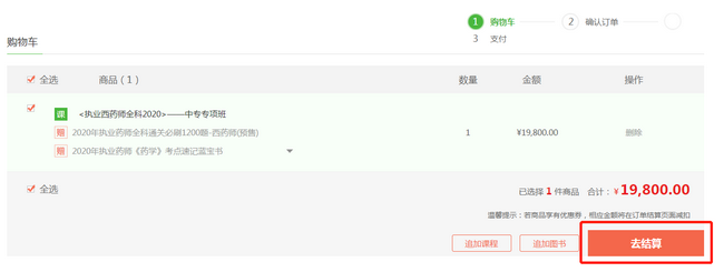 第二步:在購(gòu)物車內(nèi)確認(rèn)已選擇的課程,確認(rèn)無(wú)誤后點(diǎn)擊“去結(jié)算”;