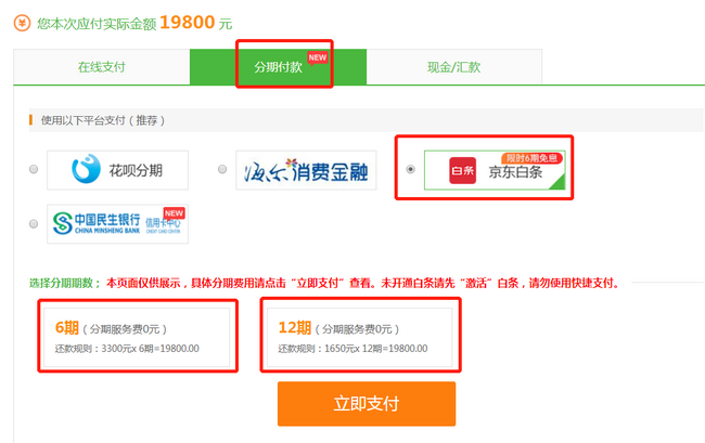 第四步:在支付頁(yè)面,選擇分期付款-京東白條進(jìn)行支付,選擇6期或12期!