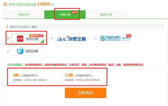 第三步:在支付頁面,選擇分期付款-京東白條進(jìn)行支付,選擇6期或12期!,切記,一定要選擇京東白條!