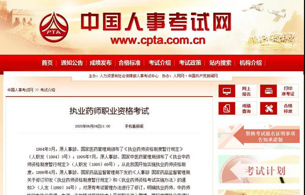 2020年6月4日,中國(guó)人事考試網(wǎng)更新了《執(zhí)業(yè)藥師資格考試》的內(nèi)容,對(duì)執(zhí)業(yè)藥師報(bào)考條件、報(bào)名辦法及告知承諾制、成績(jī)管理、證書(shū)管理等方面出了具體的規(guī)定。